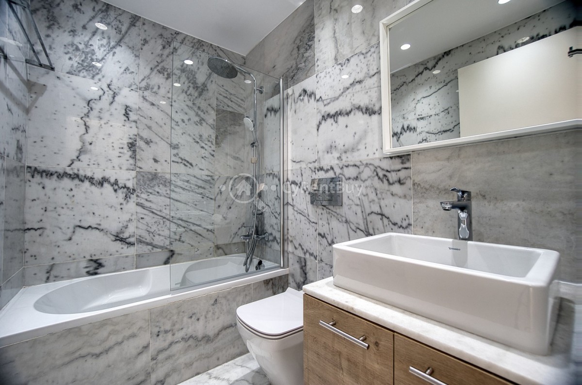 The elegant bathroom is fitted with a bathtub and modern design. With lift access to all floors, this apartment is a true gem in a prime location!