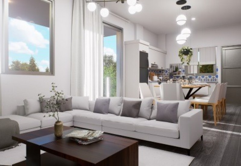The apartment features a bright open-plan living and kitchen area, designed to maximize space and natural light. The kitchen also benefits from its own private balcony, adding extra practicality and ventilation.