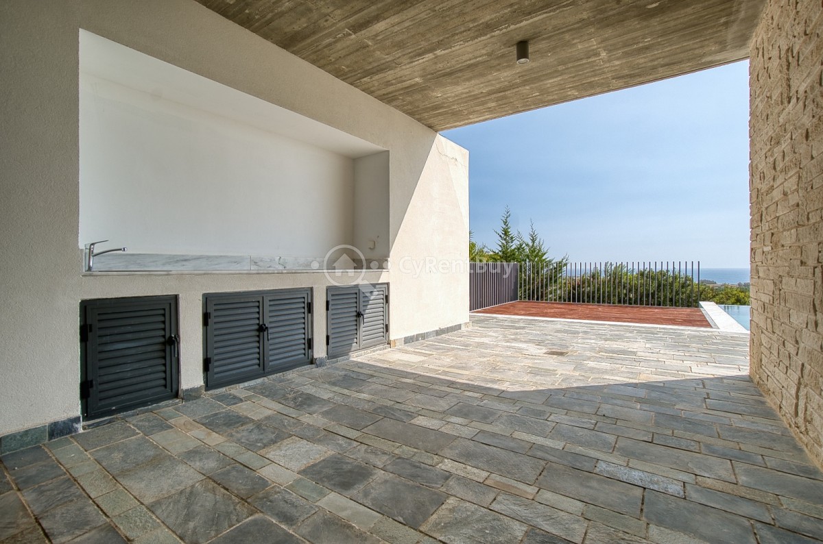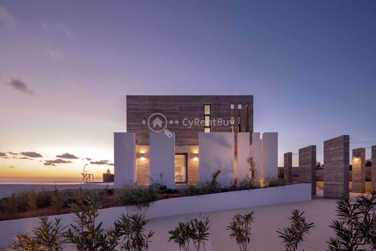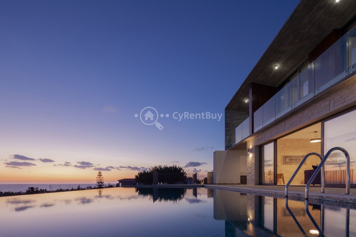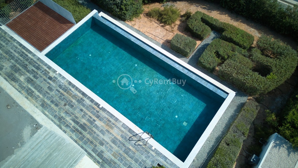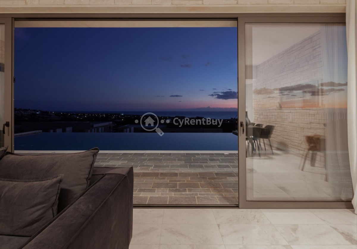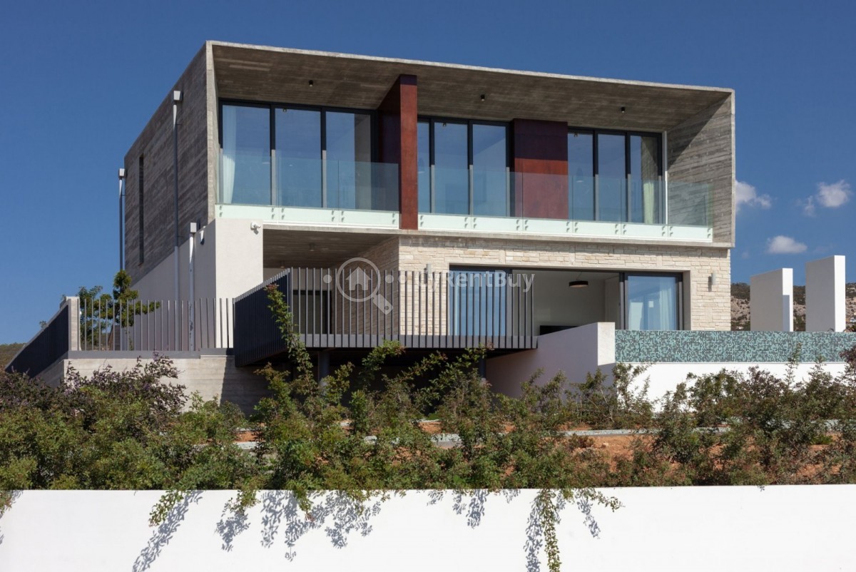 Set amidst olive trees and natural terrain, this stunning modern villa offers breathtaking views of the sparkling sea and surrounding landscape.