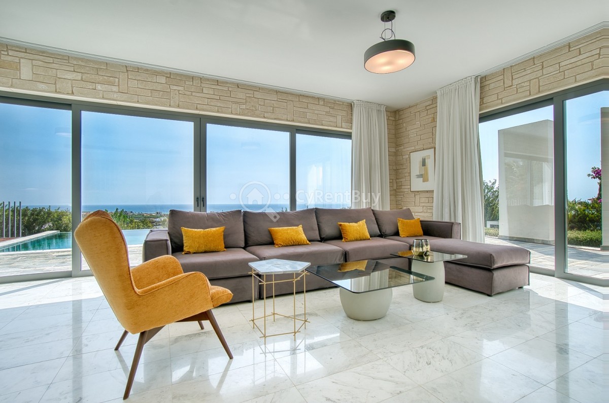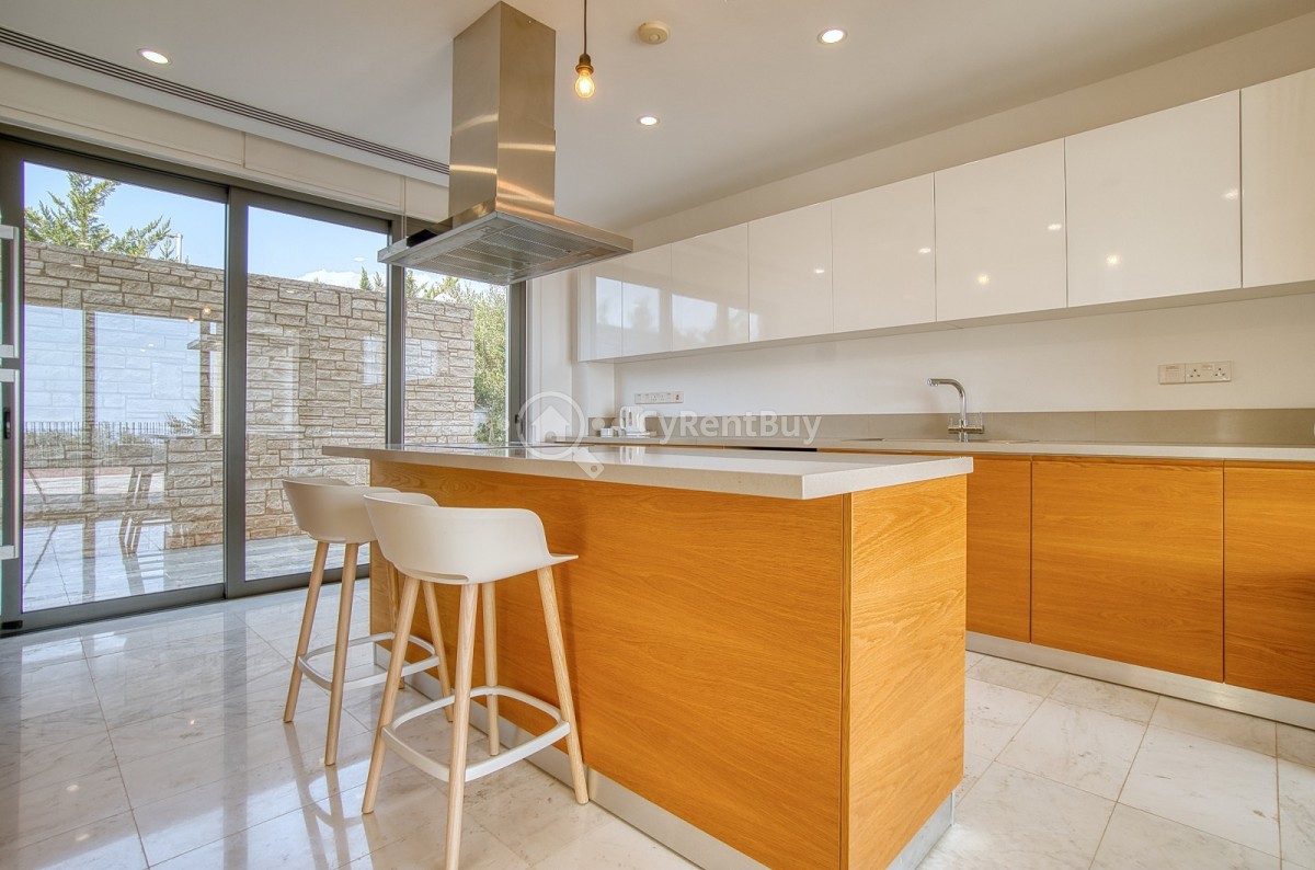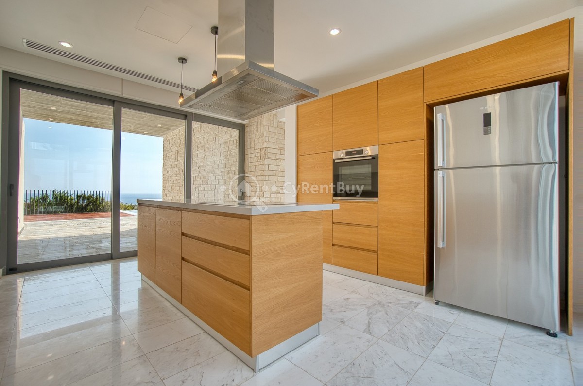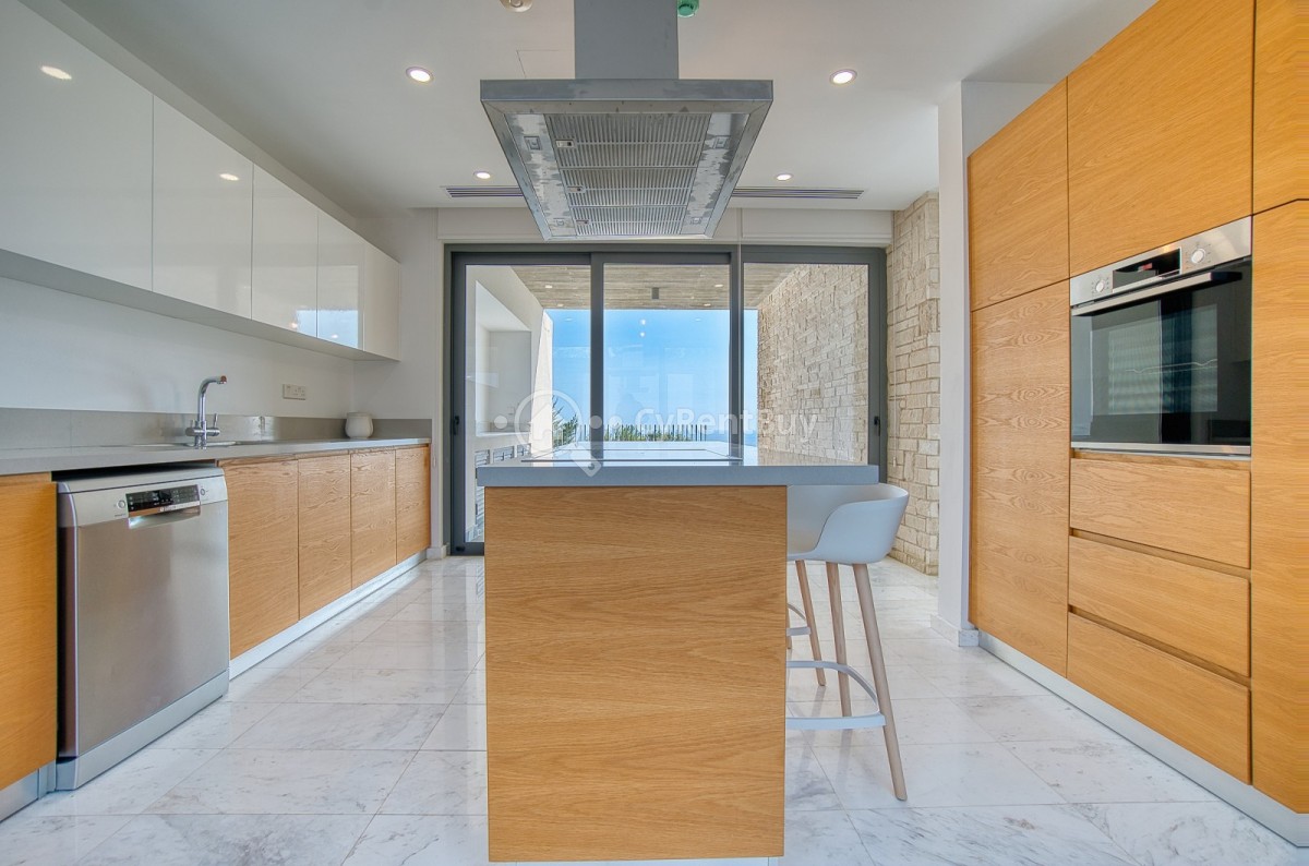 Inside, the villa boasts fantastic bedrooms, a generous living area with panoramic views, and a beautifully designed modern kitchen in warm brown tones fully equipped to impress.