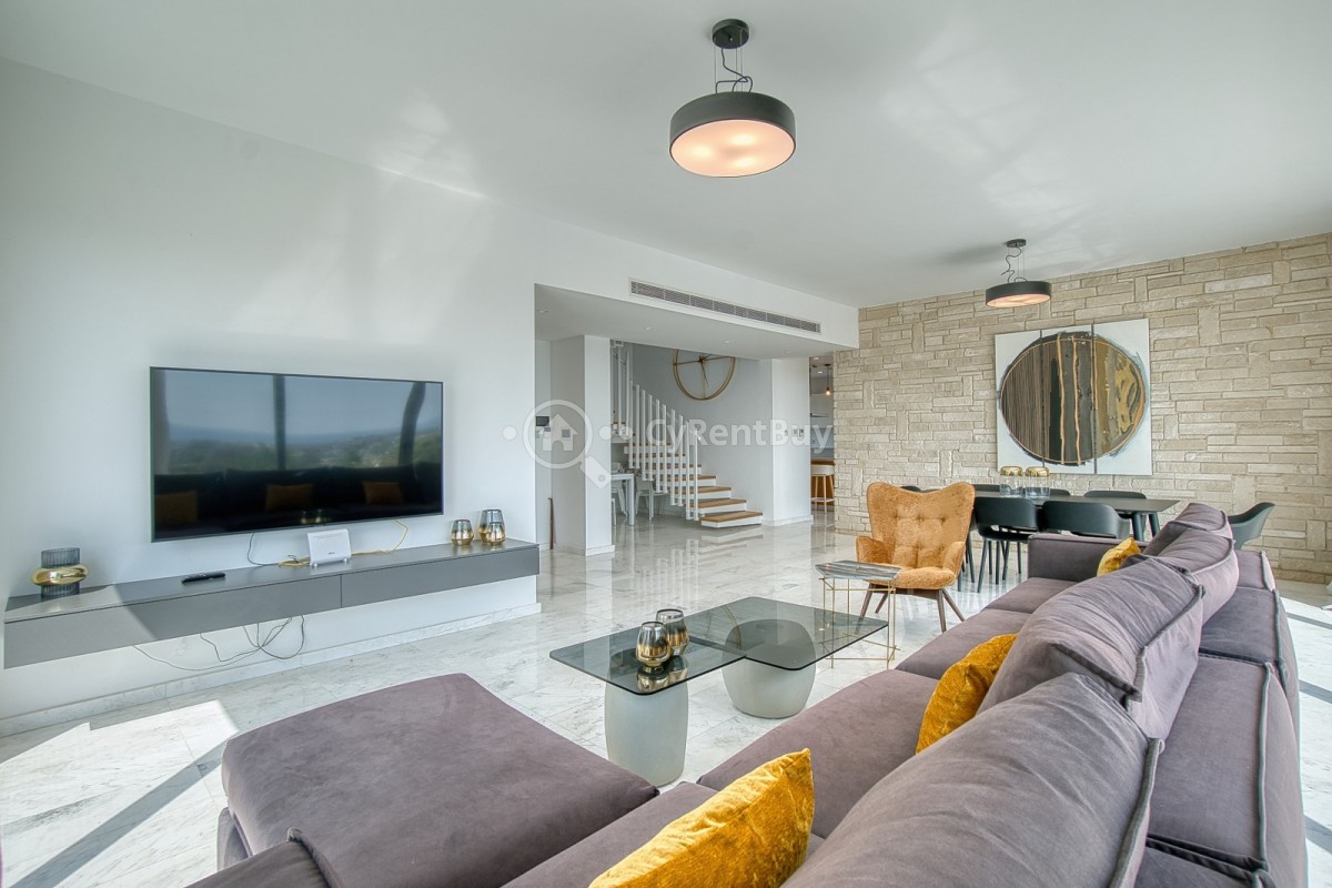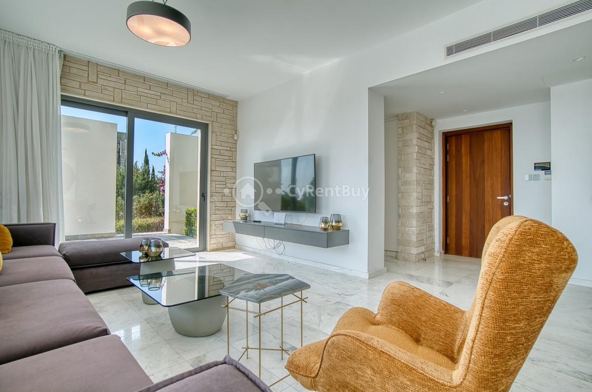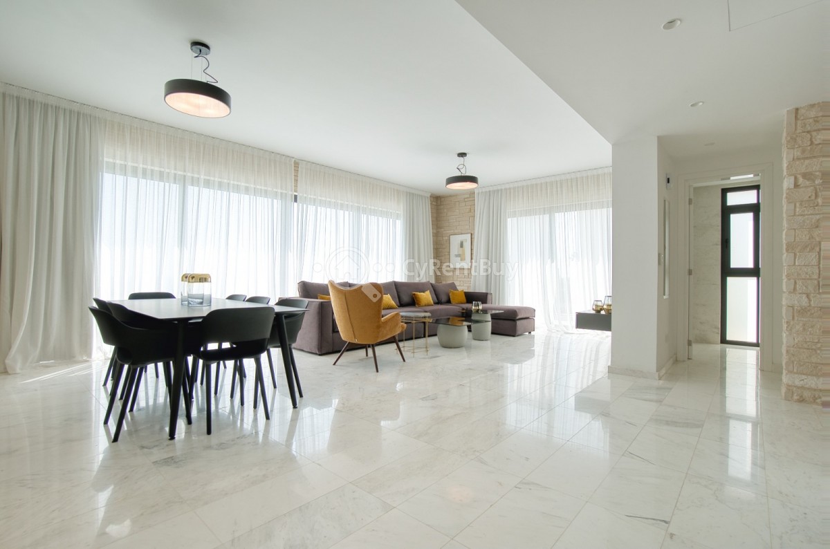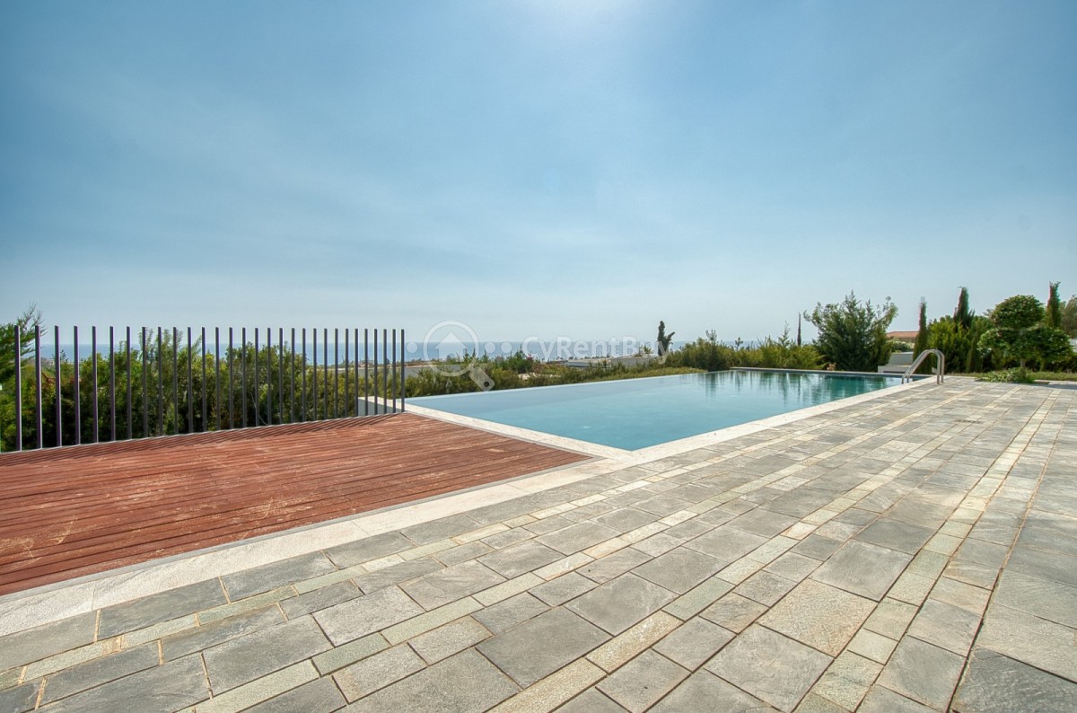 Inside, the villa boasts fantastic bedrooms, a generous living area with panoramic views, and a beautifully designed modern kitchen in warm brown tones fully equipped to impress.
