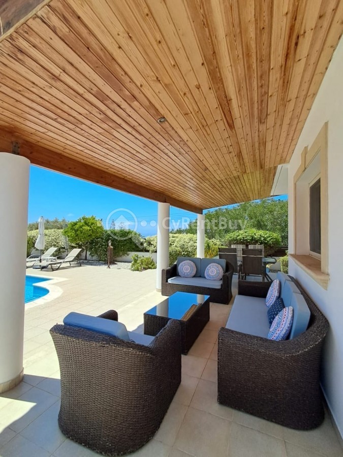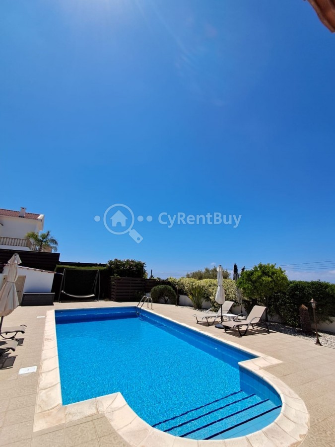 На территории — частный бассейн, зона для барбекю и ухоженный сад, где можно отдыхать и проводить время с близкими под солнцем Кипра.