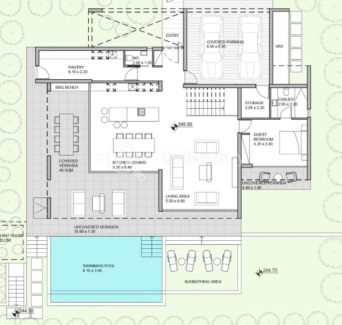 The expansive living room effortlessly connects to the lush outdoor oasis, where a sparkling swimming pool and inviting BBQ bench area.