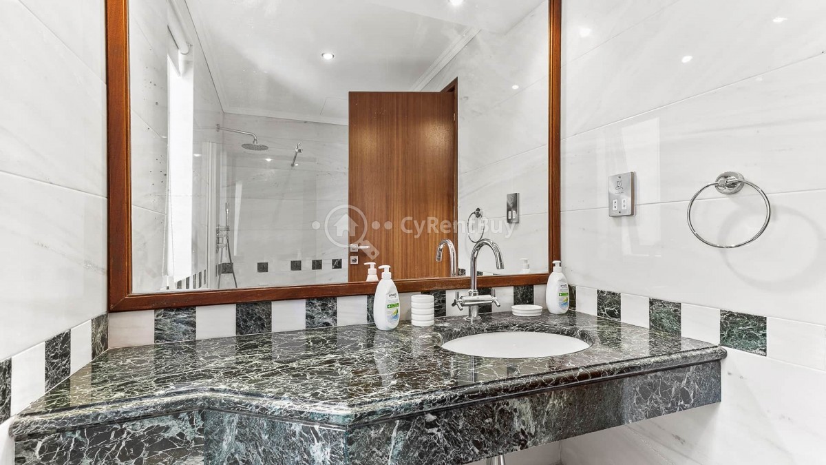 Marble stairs lead to two double bedrooms, both with luxurious en-suite facilities, wood strip floors, and fitted wardrobes. Both rooms offer views of the sea and mountains. The main bedroom has a balcony with glass panels and space for a dining table and chairs.
