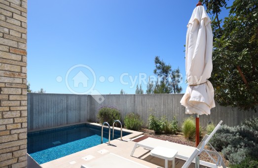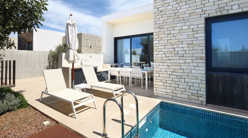 Unique villa, featuring a large garden and a sparkling swimming pool with a lovely outdoor sitting area.